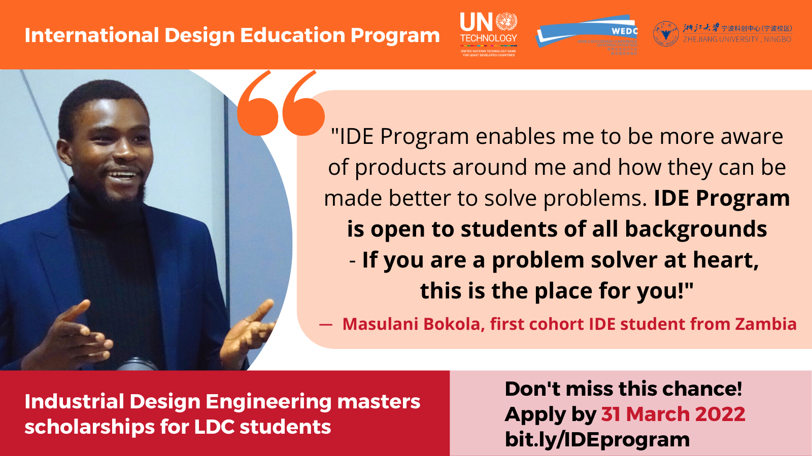 国际设计教育项目由联合国最不发达国家技术银行、世界生态设计会和浙江大学宁波校区联合发起。Masulani Bokola(中文名:安泰)作为首批国际设计教育项目工业设计工程的硕士研究生,在访谈中分享了他的学习经历及项目对自身发展的影响,并给准备加入国际设计教育项目的学生提出了一些建议。