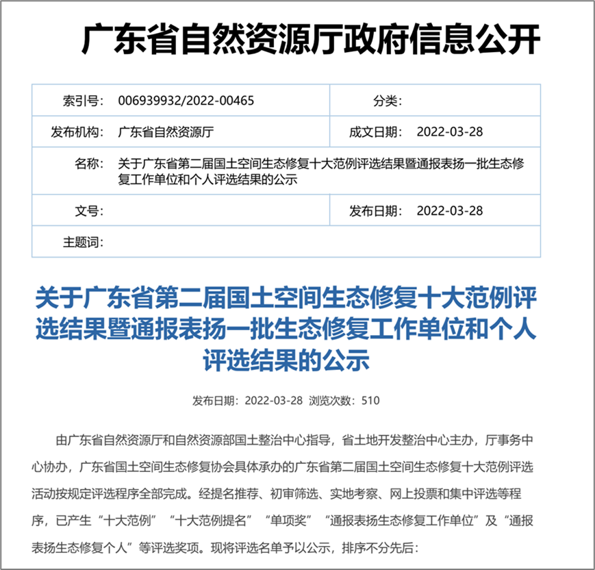 近日,《关于广东省第二届国土空间生态修复十大范例评选结果暨通报表扬一批生态修复工作单位和个人评选结果的公示》在广东省自然资源厅网站发布,生态设计小镇建设暨鸭洞河治理工程在该评比中荣获“生态修复设计奖”殊荣。