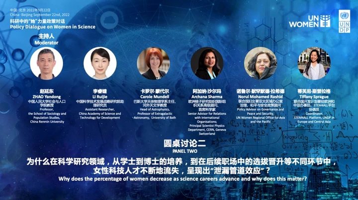 联合国开发计划署与联合国妇女署举办科研中的“她”力量政策对话。邀请来自各国的政策制定者、专家学者、科研工作者、联合国各机构代表就如何赋能女性参与科研工作并提升科研领域女性领导层占比展开讨论。