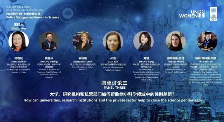 圆桌讨论三聚焦于科学领域的性别差距,集中探讨包括政府、大学、研究机构和私营企业在内的各利益相关方如何携手共创有利外部环境,培养高层次女性科研人才,提高女性在科研领域的成就感与认可度,以鼓励更多的女性科研人员参与决策管理,在科技创新中发挥更大的作用。本圆桌讨论环节由联合国妇女署中国办公室合作伙伴关系专员杨睿侃主持。