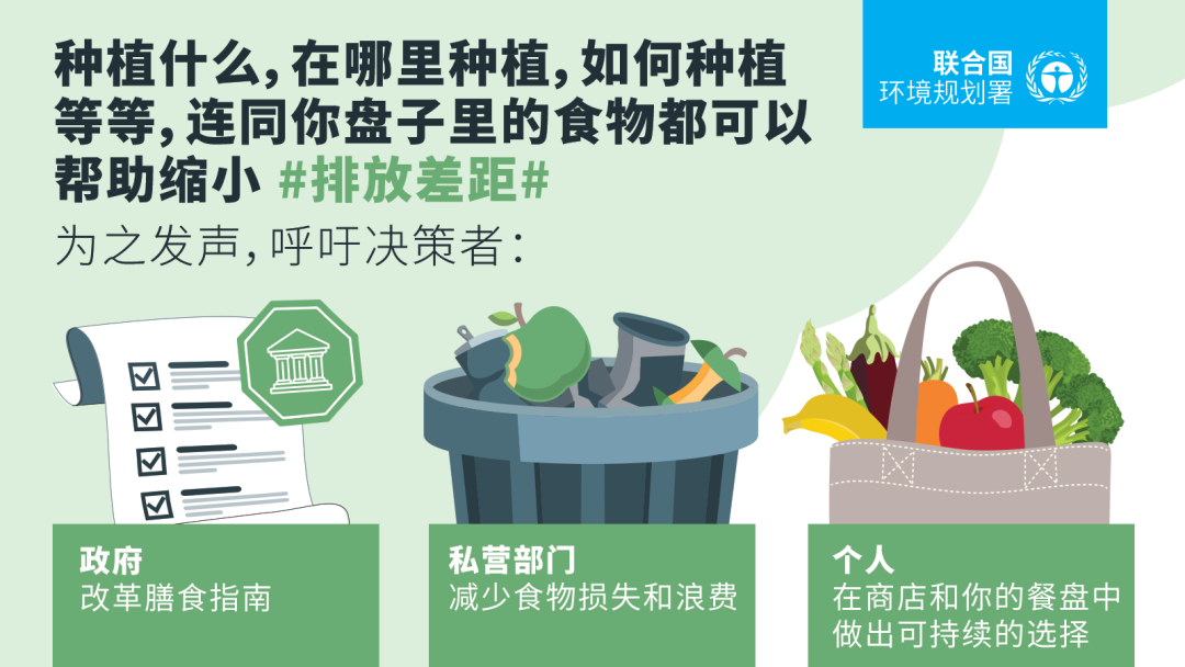 政府可以通过改革补贴和税收计划促进转型。私营部门可以减少食物损失和浪费,使用可再生能源,开发新型食品,减少碳排放。公民个人可以改变他们的生活方式,为环境可持续性和减少碳排放来选择食物,这也将带来许多健康益处。